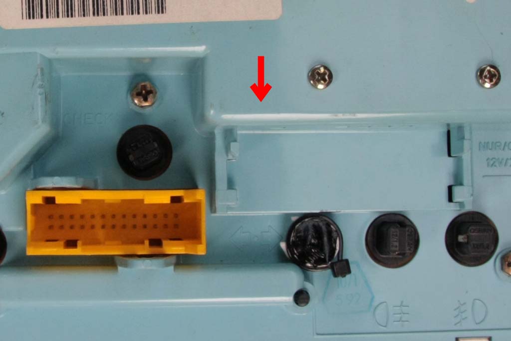 車種によっては矢印の位置に緑色のパーツが付いていてハーネスが付いていることも・・・ハーネスが抜け落ちないように注意。これを取らないとスピードメーターが外れません。ちなみに黄色い端子はオンボードコンピュータII用の端子です。