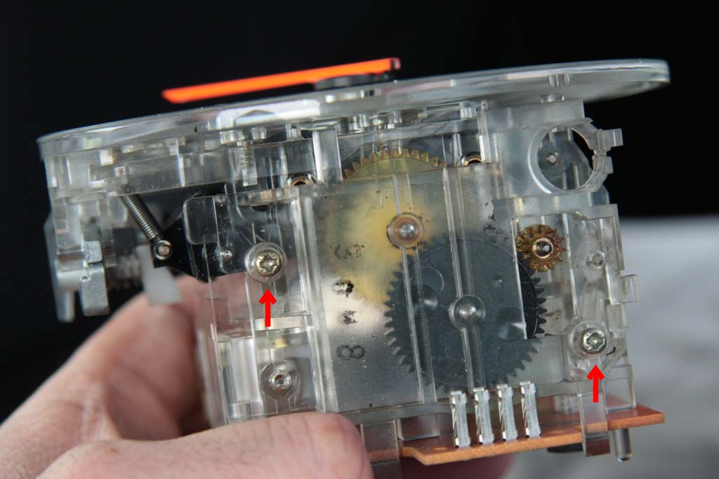 メーターが取れました。矢印の2本のネジを取ればギアの交換も出来ます。