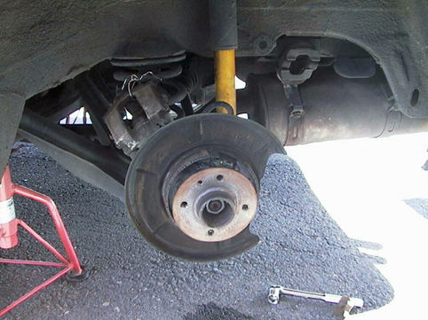稼動側のキャリパーを外したところです。キャリパーはスプリングに針金で落ちない様に固定しました。