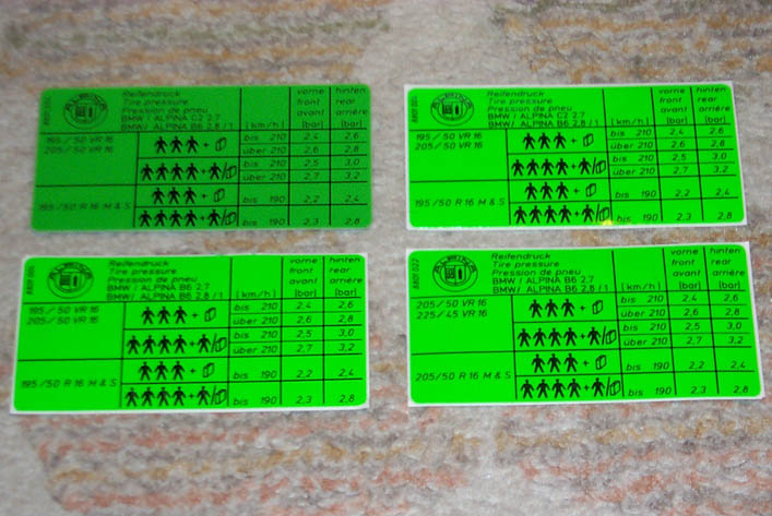 | ニコルさん、いやいやブルカルトボーフェンジーペンさん、どうもすみません。m_ . . _m タイヤ空気圧ステッカーが製造中止で、かといって本物を使用するのがもったいないので、復刻版を作ってしまいました。 左上がモノホン、右上がその復刻版(共に本国仕様のC2 2,7) 左下が日本仕様のB6 2,7に変更した物、右下が想像でB6 2,7の後期仕様を作成したものです。 ちなみに、本国仕様のC2 2,7(前期)はフロント195/50VR16リア205/50VR16だったんでしょうか!? B6 2,7(C2 2,7)の前期は当初205/50VR16を4本、前期の終わりと後期(B3 2,7)はフロント205/50ZR16リア225/45ZR16なんでしょうかねぇ??? このステッカーに関してお問い合わせはご遠慮ください。 | ||
